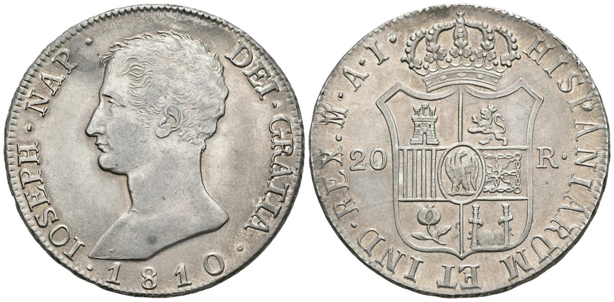 JOSE NAPOLEON. 20 Reales. 1810. Madrid AI. Cal-25. Ar. 27,02g. Restos del brillo original. EBC+.