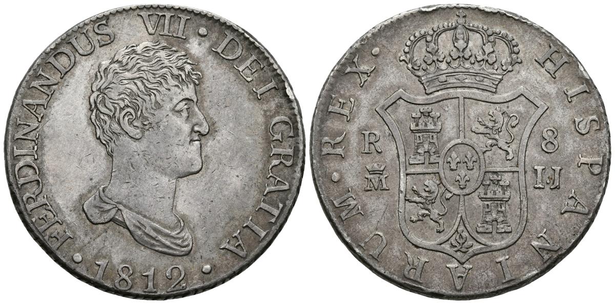 FERNANDO VII. 8 Reales. 1812. Madrid IJ. Primer año de busto desnudo. Cal-496. Ar. 26,84g. Preciosa pátina, golpes en el canto. MBC-. Muy rara.