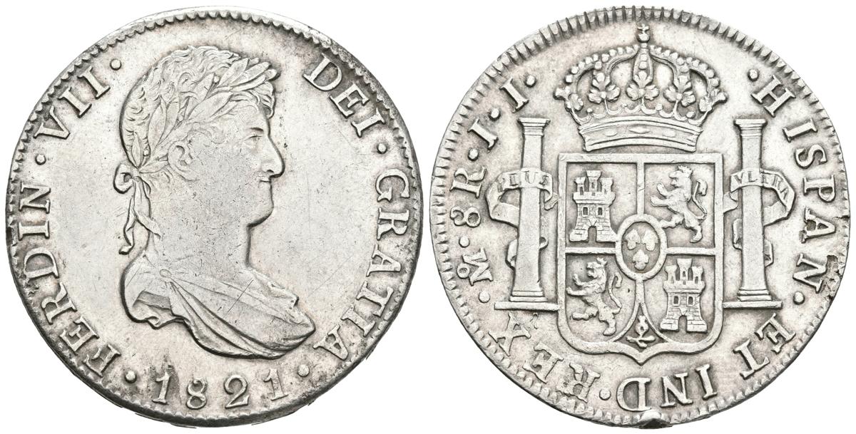 FERNANDO VII. 8 Reales. 1821. México JJ. Cal-565. Ar. 26,87g. Golpe en el canto. MBC+.