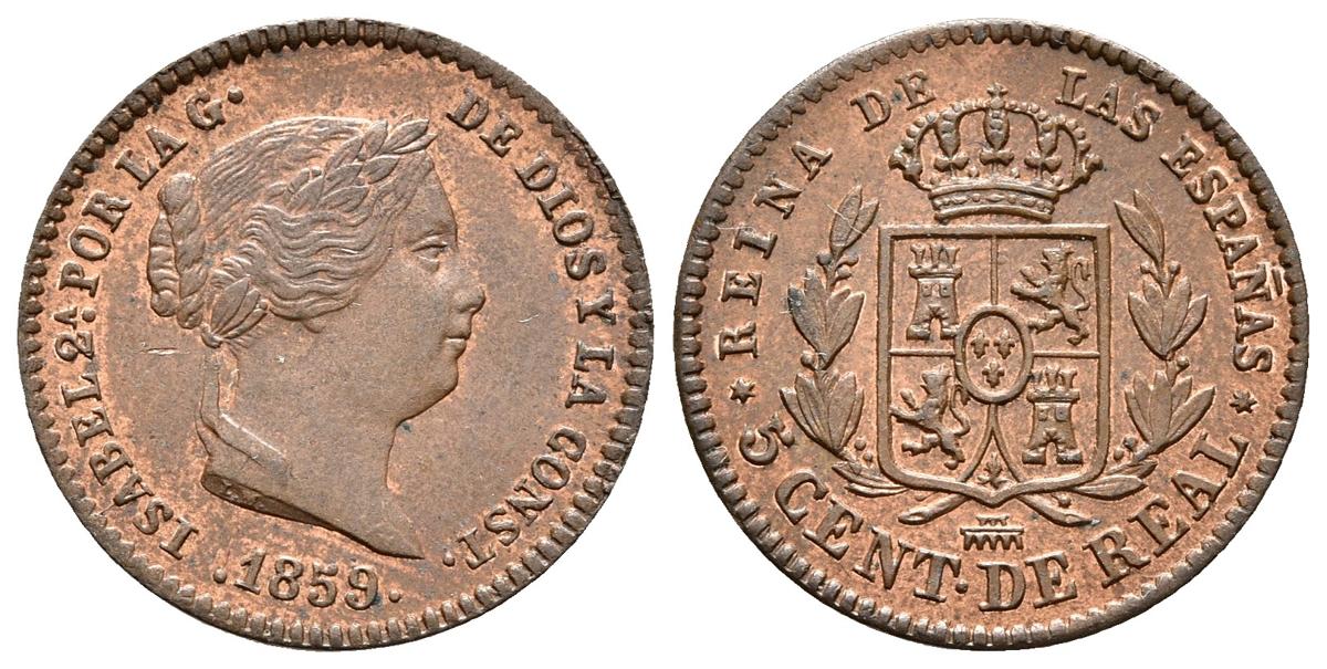 ISABEL II. 5 Céntimos de real. 1859. Segovia. Cal-616. Ae. 1,86g. Rayita en anverso. SC-.