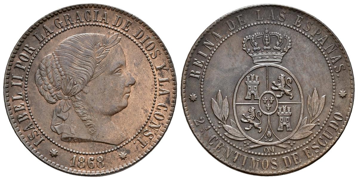 ISABEL II. 2 1/2 Céntimos de escudo. 1868. Barcelona OM. Cal-641. Ae. 6,39g. EBC.