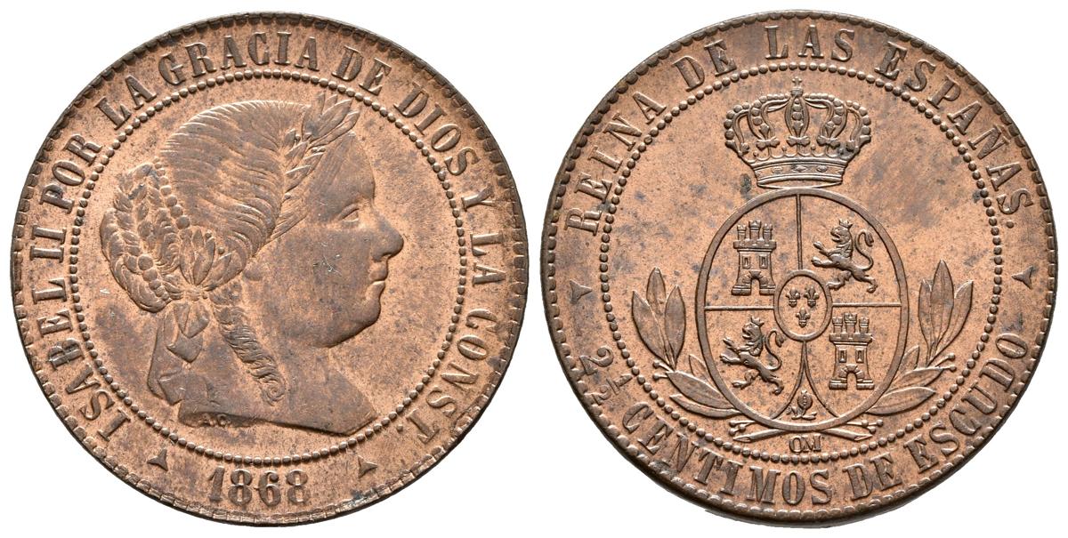 ISABEL II. 2 1/2 Céntimos de escudo. 1868. Segovia OM. Cal-648. Ae. 6,26g. Brillo original. SC-.