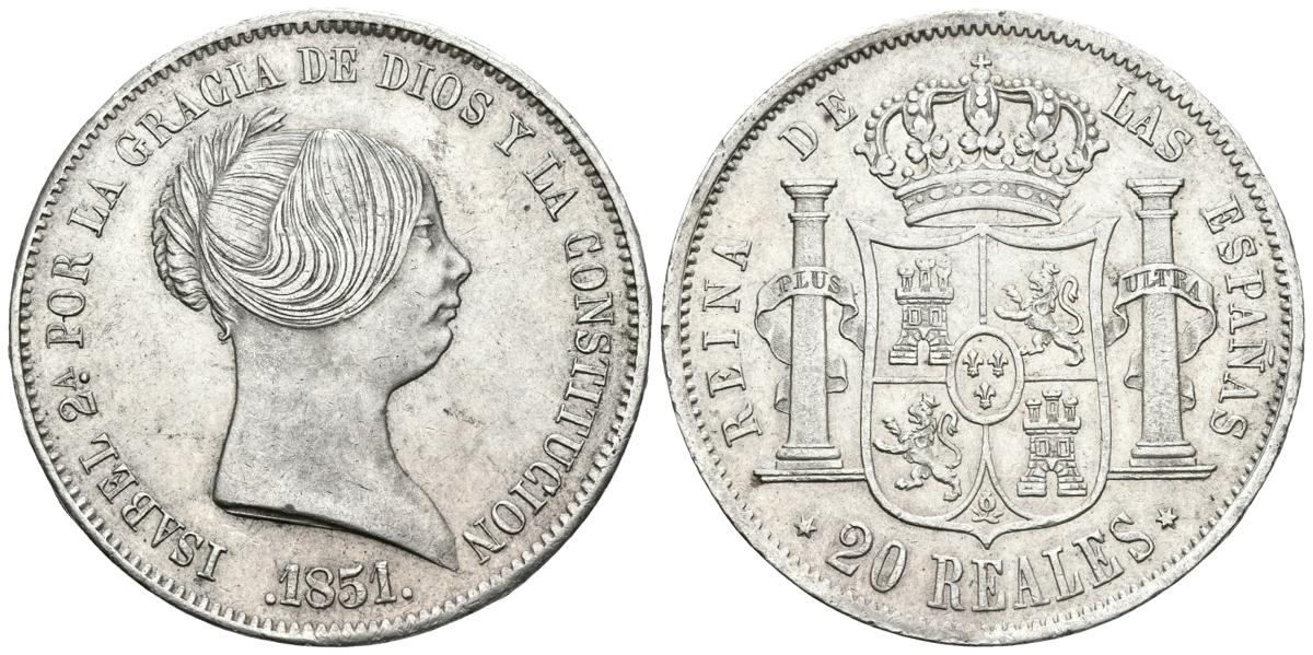 ISABEL II. 20 Reales. 1851. Madrid. Cal-172. Ar. 25,96g. MBC+.