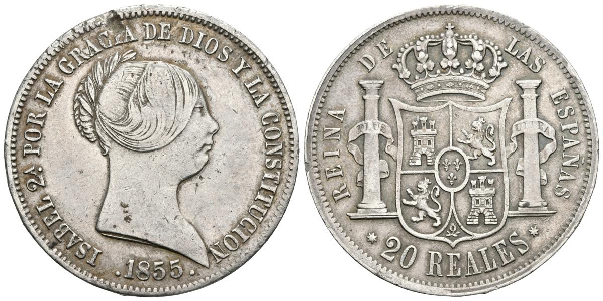 ISABEL II. 20 Reales. 1855. Sevilla. Cal-193 Ar. 25,86g. Falta de metal en anverso. MBC-/MBC+.