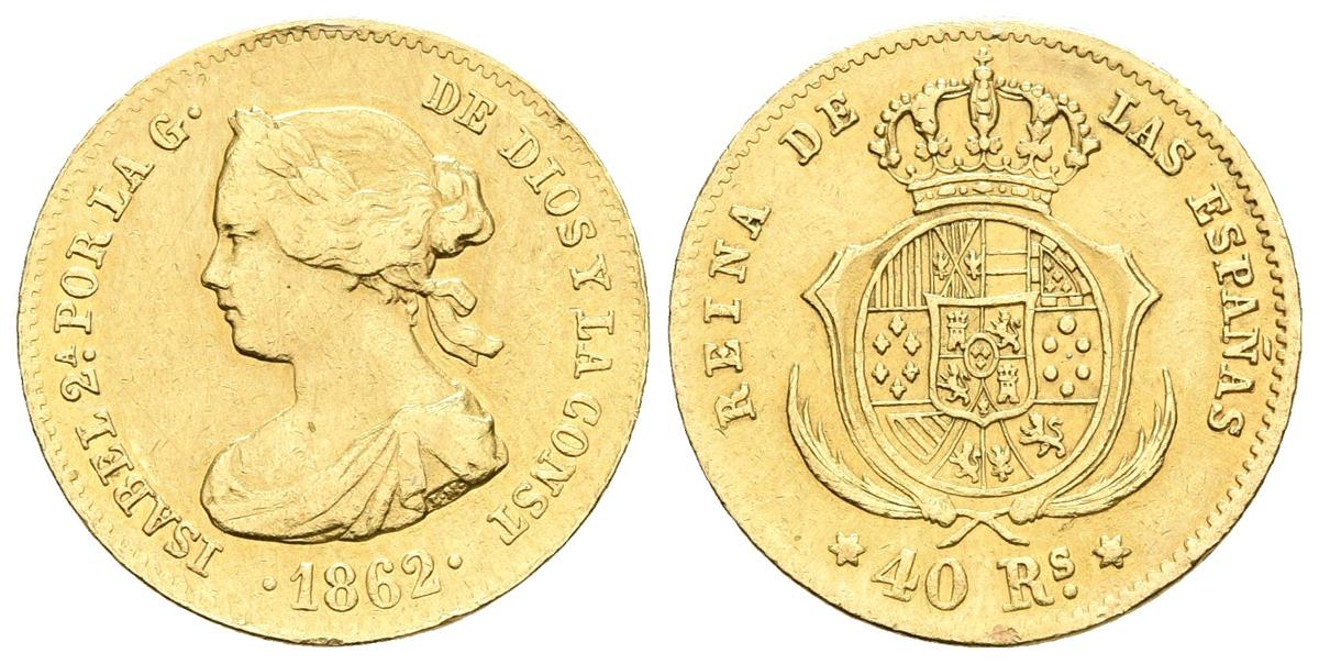 ISABEL II. 40 Reales. 1862. Madrid. Cal-104. Au. 3,35g. MBC-.