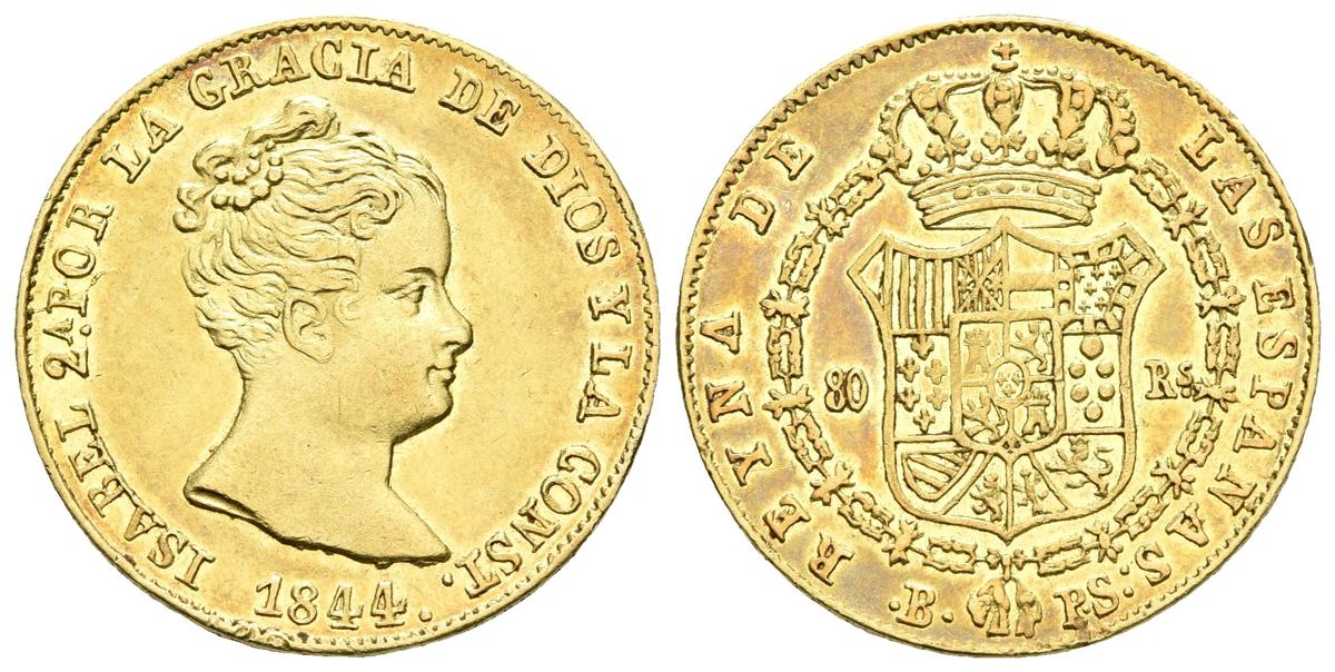 ISABEL II. 80 Reales.1844. Barcelona PS. Cal-62. Au. 6,75g. MBC+/MBC.