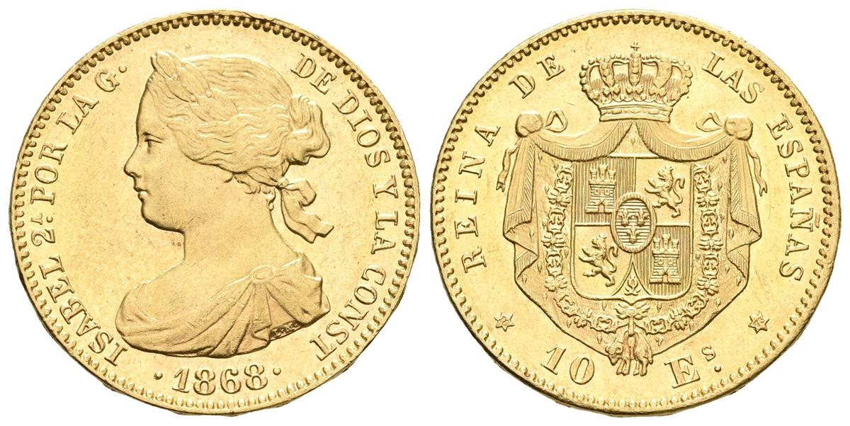 ISABEL II. 10 Escudos. 1868 *18-73. Madrid. Cal-48. Au. 8,42g. EBC+/SC-. Ex Ibercoin 11.