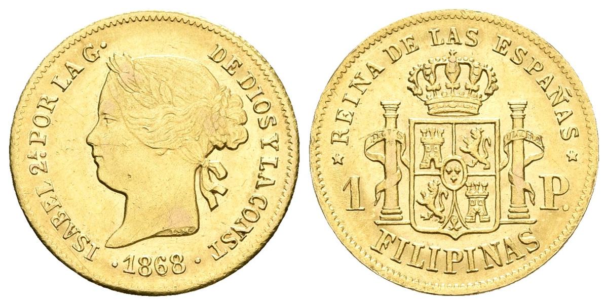 ISABEL II. 1 Peso. 1868. Manila. Cal-150. Au. 1,71g. MBC/MBC+.