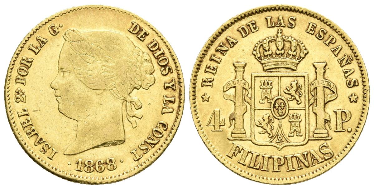 ISABEL II. 4 Pesos. 1868/58. Manila. Cal-132var. Au. 6,73g. MBC.