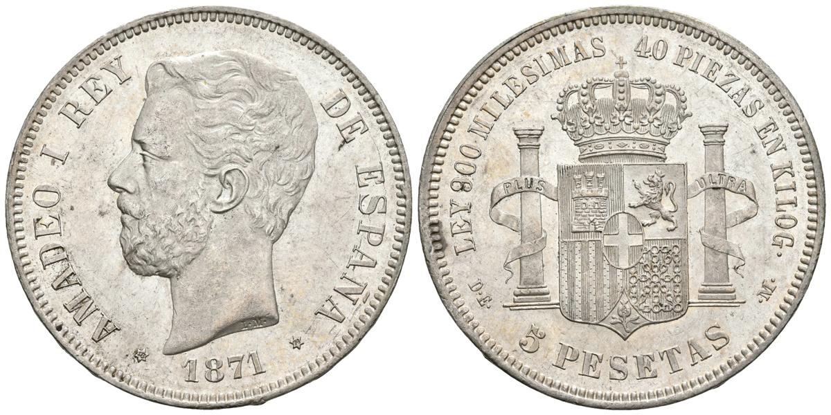 AMADEO I. 5 Pesetas. 1871 *18-74. Madrid DEM. Cal-10. Ar. 24,90g. Conserva gran parte de su brillo original, algunas marquitas. EBC+/SC-.