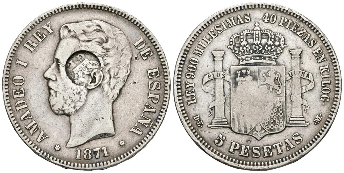 AMADEO I. 5 Pesetas. 1871 *18-74. Madrid DEM. Resello del Gobierno Portugués, GP bajo corona. Aplicado en el archipiélago de Las Azores según el decreto de 1887. Cal-10. Ar. 24,82g. MBC.