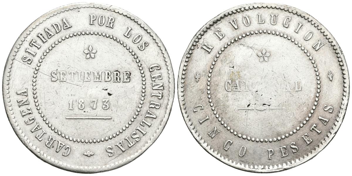 REVOLUCION CANTONAL. 5 Pesetas. 1873. Cartagena. Cal-5. Anverso y reverso coincidentes. Ar. 28,10g. Defecto de metal en anverso y golpes en el canto. MBC-.