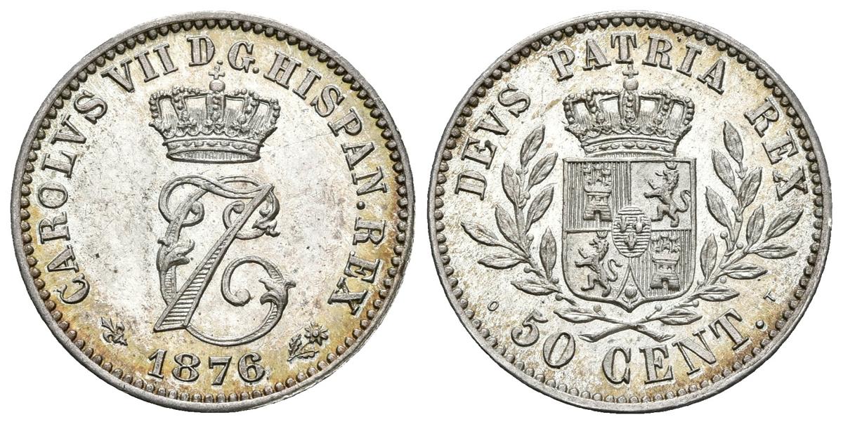 CARLOS VII. 50 Céntimos. 1876. Bruselas. Cal-7. Ar. 2,52g. Brillo original y precioso tono. SC-.