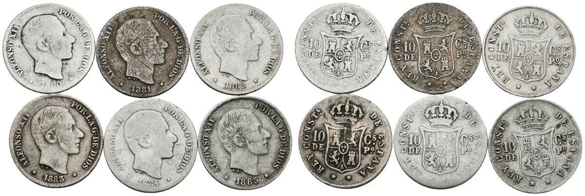 ALFONSO XII. 10 Centavos de Peso. Manila. Serie completa 1880, 1881, 1882, 1883, 1884 y 1885. Cal-93/98. Ar. BC-/MBC-.