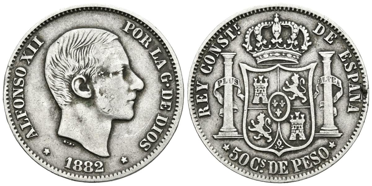 ALFONSO XII. 50 Centavos de Peso. 1882. Manila. Cal-82. Ar. 12,85g. MBC.
