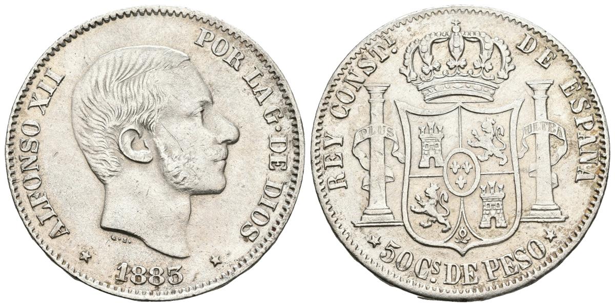 ALFONSO XII. 50 Centavos de Peso. 1883. Manila. Cal-83. Ar. 12,88g. Levemente cóncava. MBC+.
