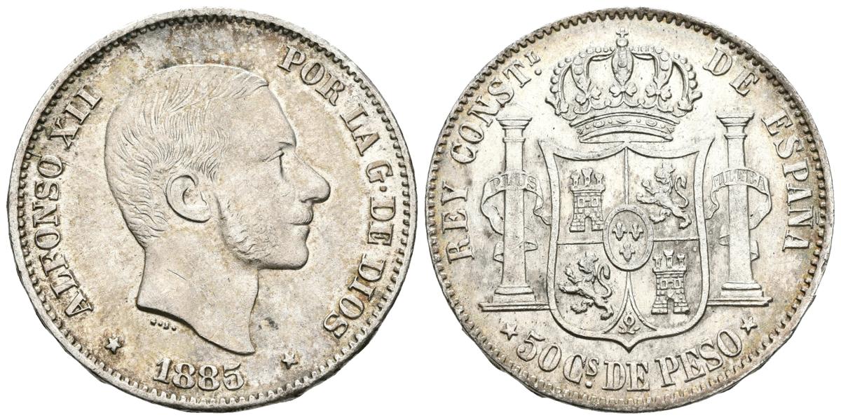 ALFONSO XII. 50 Centavos de Peso. 1885. Manila. Cal-86. Ar. 12,85g. MBC+.