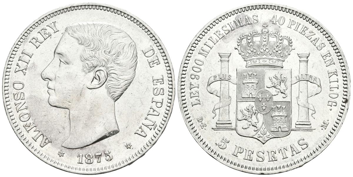 ALFONSO XII. 5 Pesetas. 1875 *18-75. Madrid DEM. Cal-25a. Ar. 24,95g. Marquitas en anverso. EBC-.
