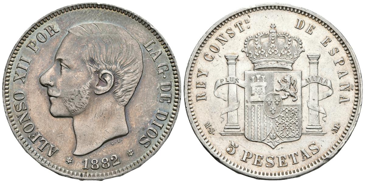 ALFONSO XII. 5 Pesetas. 1882 *18-82. Madrid MSM. Cal-36. Ae. 24,91g. Preciosa pátina. MBC.