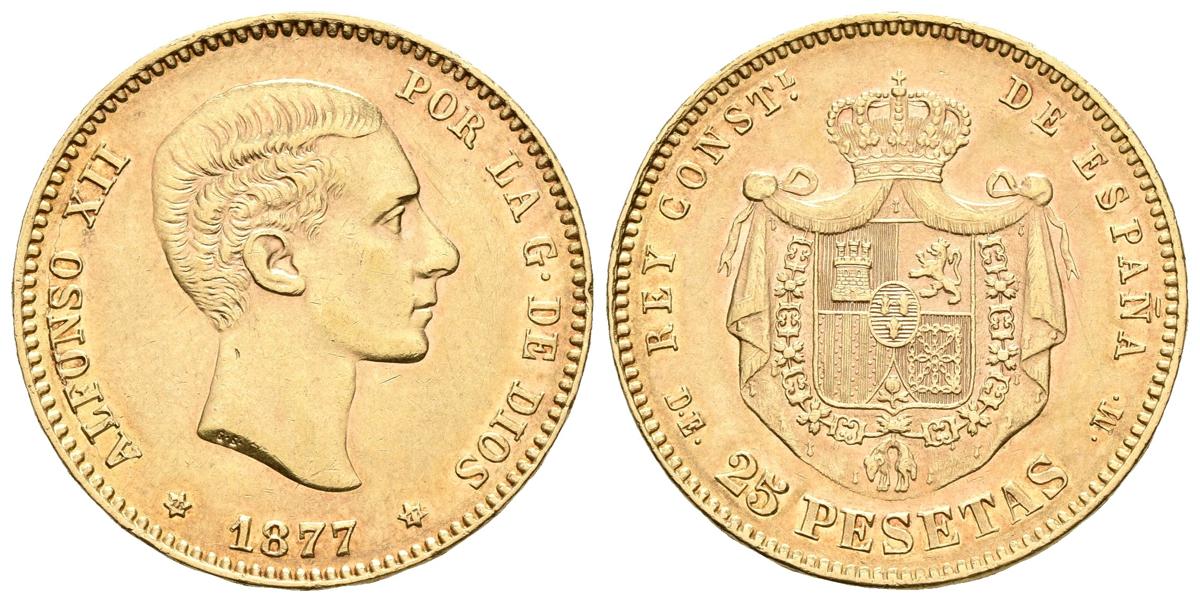 ALFONSO XII. 25 Pesetas. 1877 *18-77. Madrid DEM. Cal-3. Au. 8,06g. MBC+/EBC-.