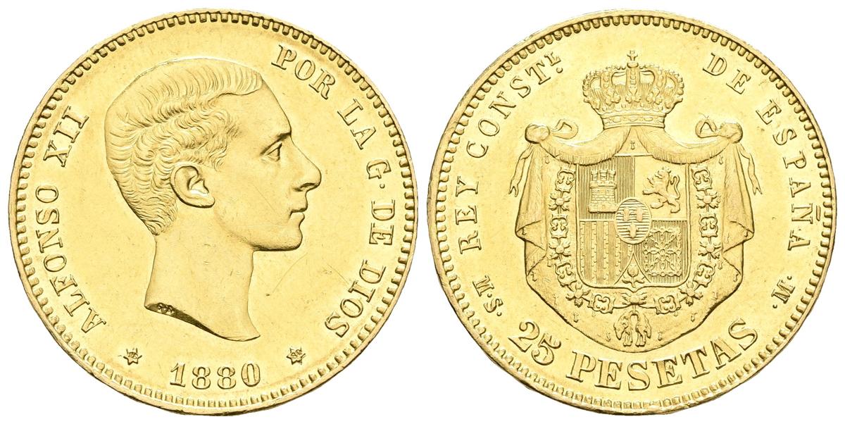 ALFONSO XII. 25 Pesetas. 1880 *18-80. Madrid. MSM. Cal-10. Au. 8,06g. Rayitas en anverso. EBC.