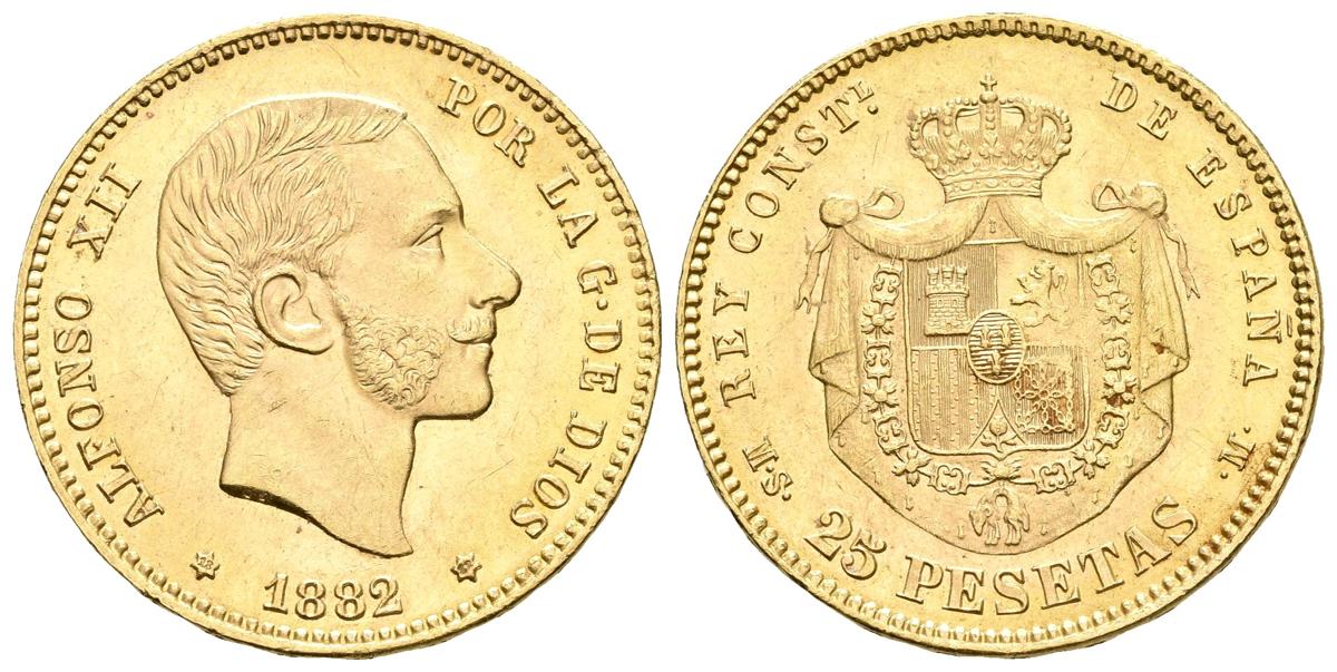 ALFONSO XII. 25 Pesetas. 1882 *18-82. Madrid MSM. Cal-16. Au. 8,05g. EBC. Escasa.