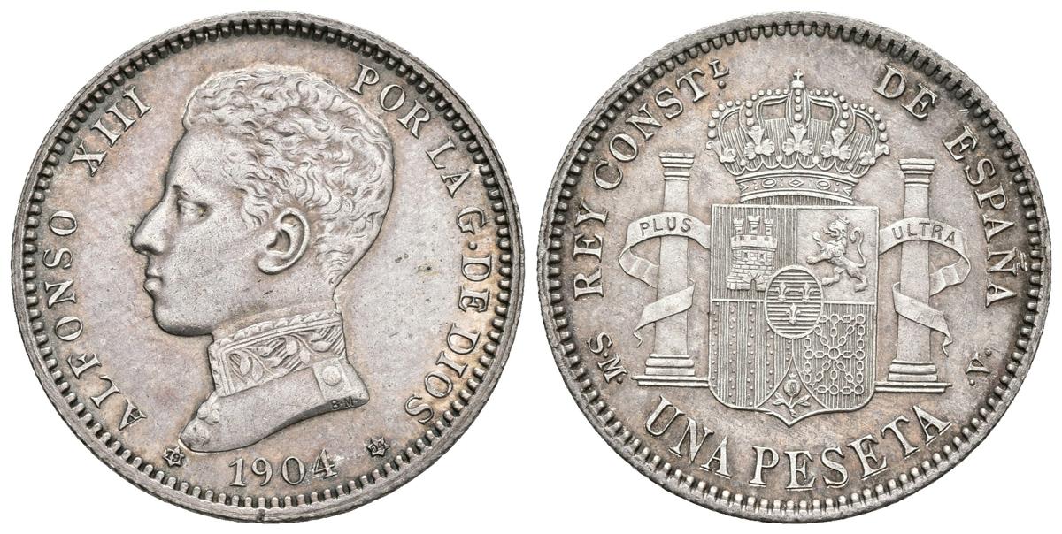 ALFONSO XIII. 1 Peseta. 1904 *19-04. Madrid SMV. Cal-50. Ar. 5,00g. Preciosa pátina. EBC.