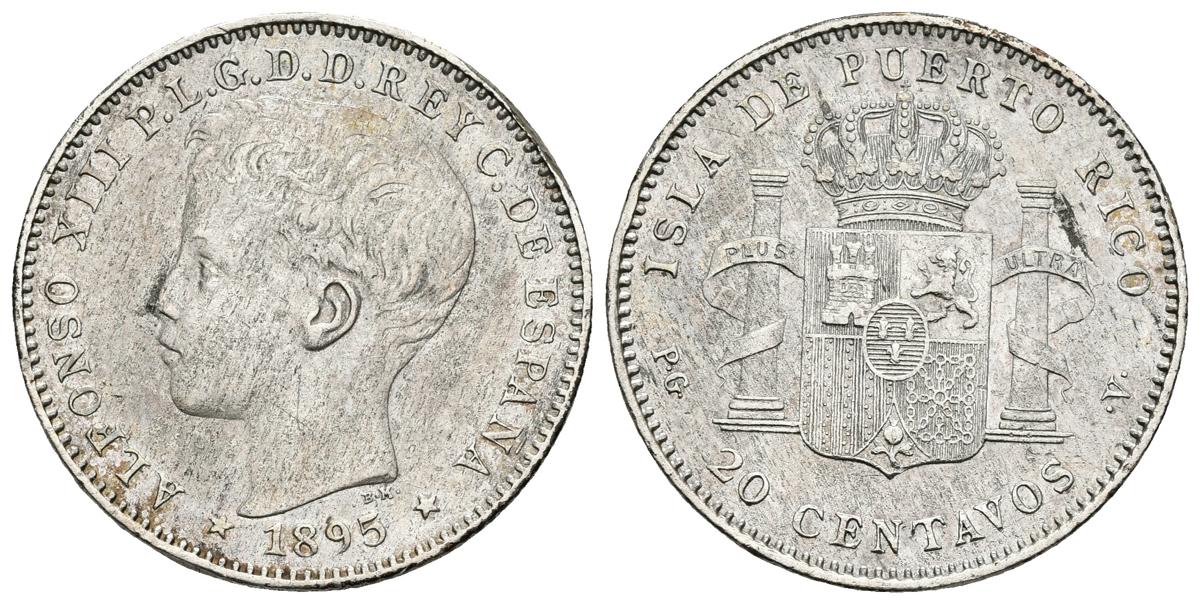 ALFONSO XIII. 20 Centavos. 1895. Puerto Rico PGV. Cal-84. Ar. 4,96g. Limadura en el canto. MBC+.