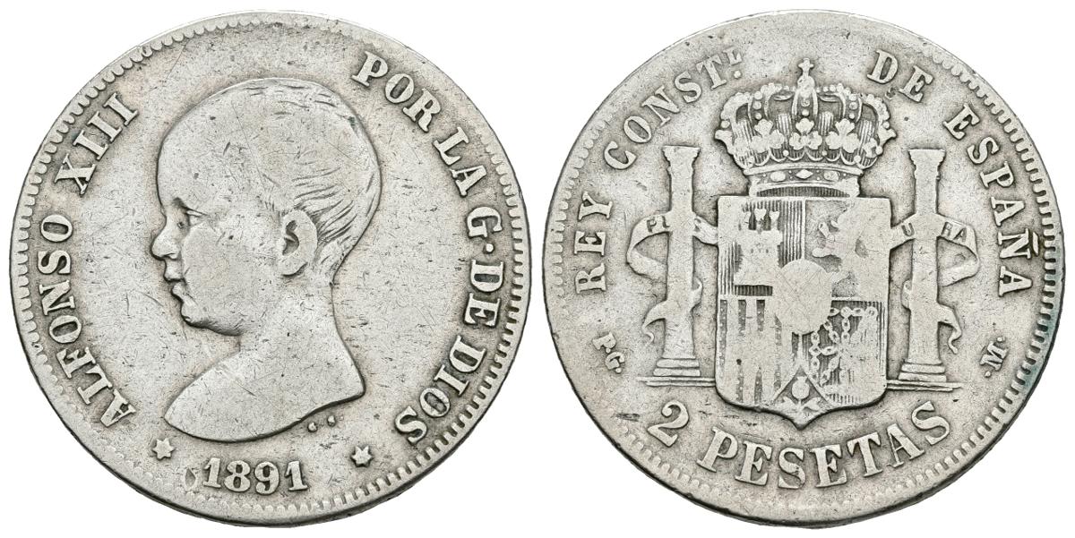 ALFONSO XIII. 2 Pesetas. 1891 *18-91. Madrid PGM. Cal-31. Ar. 9,70g. BC-. Rara.