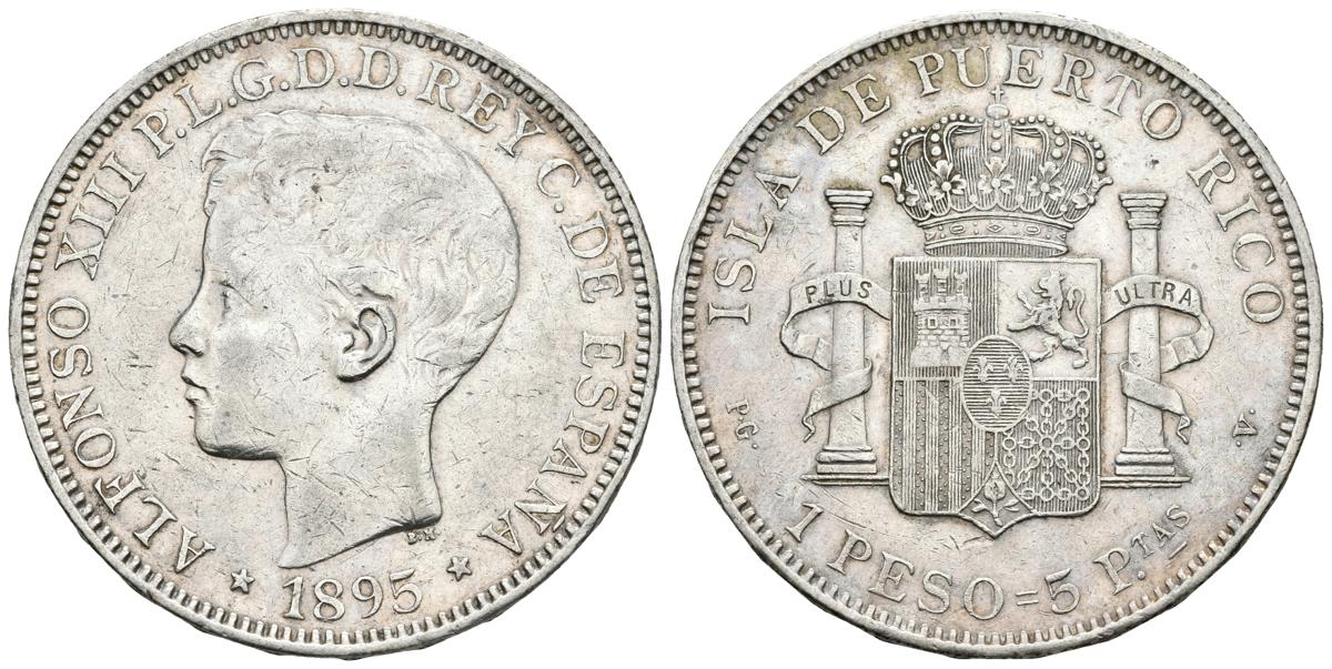 ALFONSO XIII. 1 Peso. 1895. Puerto Rico PGV. Cal-82. Ar. 24,90g. Rayitas en anverso y golpecitos en el canto. MBC. Rara.