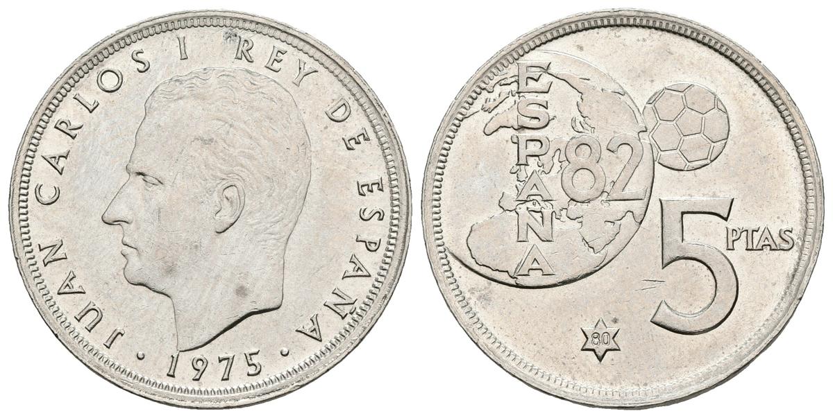 JUAN CARLOS I. 5 Pesetas. 1975 *80. ERROR del Mundial. Cal-124. Cu-Ni. 5,73g. Golpe en anverso. EBC-/MBC+.