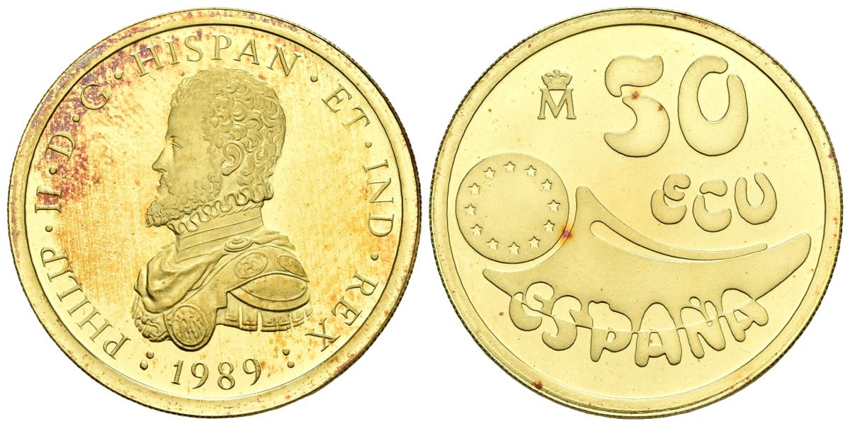 JUAN CARLOS I. 50 Ecu. 1989. Felipe II. Au. 17,26g. Presentado en estuche oficia. PROOF.