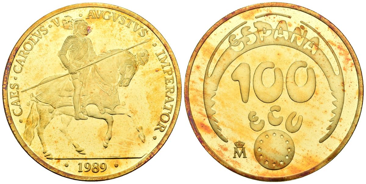 JUAN CARLOS I. 100 Ecu. 1989. Carlos V. Au. 34,76g. Presentado en estuche oficial con manchas de pátina. PROOF.