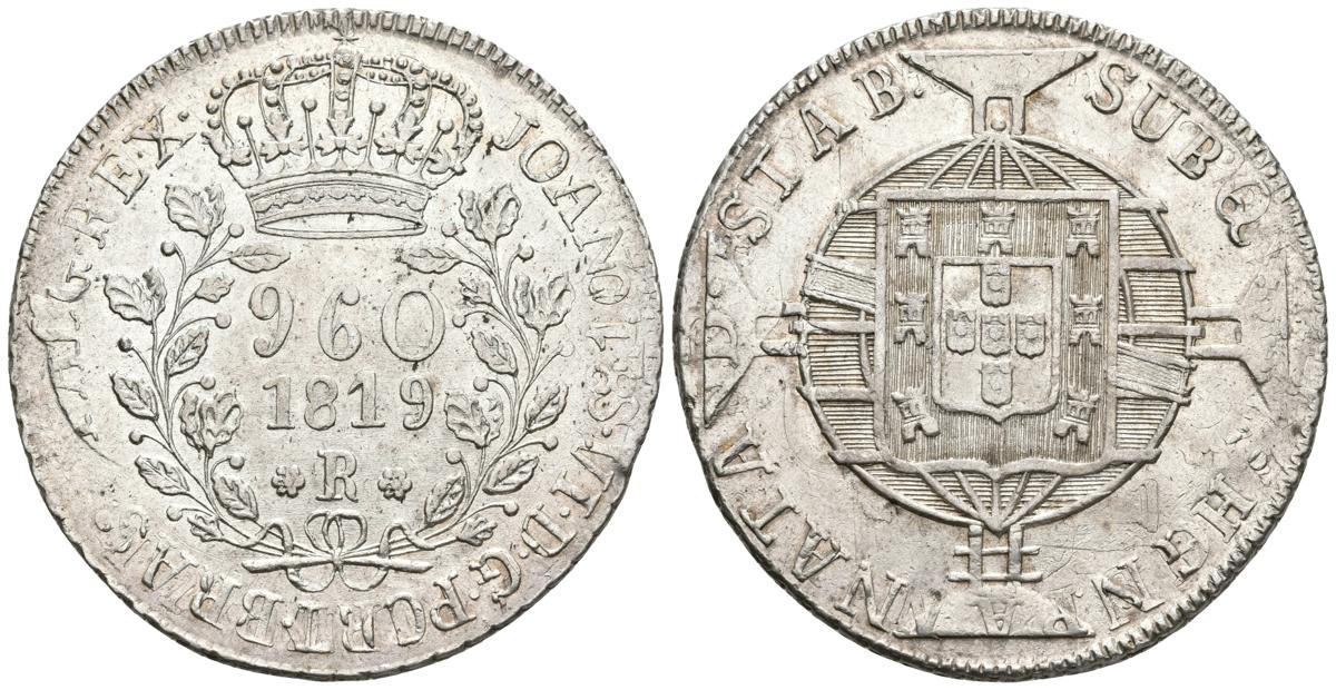 BRASIL. Johannes VI. 960 Reis. 1819. Río de Janeiro. Km#326.1. Ar. 26,17g. Acuñada sobre un 8 reales de Fernando VII. 1810. Lima JP. Busto indigena. EBC. Escasa.