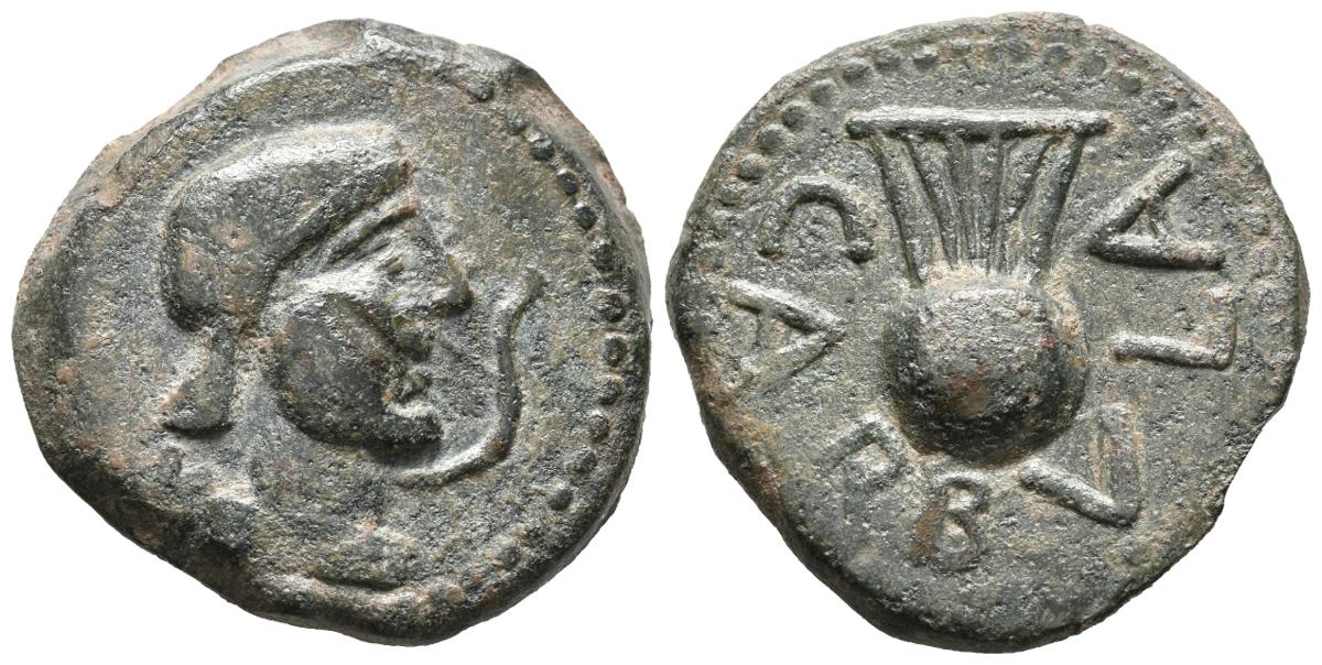 CARBULA (Almodóvar del Río, Córdoba). As. (Ae. 16.08g / 24mm). 80 BC (FAB-440). Anv: Apollo's head to the right, behind Iberian Ta, in front, snake? Rev: Lira, below legend: CARBVLA, all within laurea. Good Very Fine.