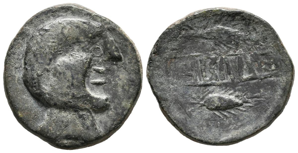 CARMO (Carmona, Sevilla). Semis. (Ae. 6.37g / 23mm). 80 BC (FAB-459). Anv: Male head to the right. Rev: Two spikes on the right, including legend: CARMO. Good Fine.