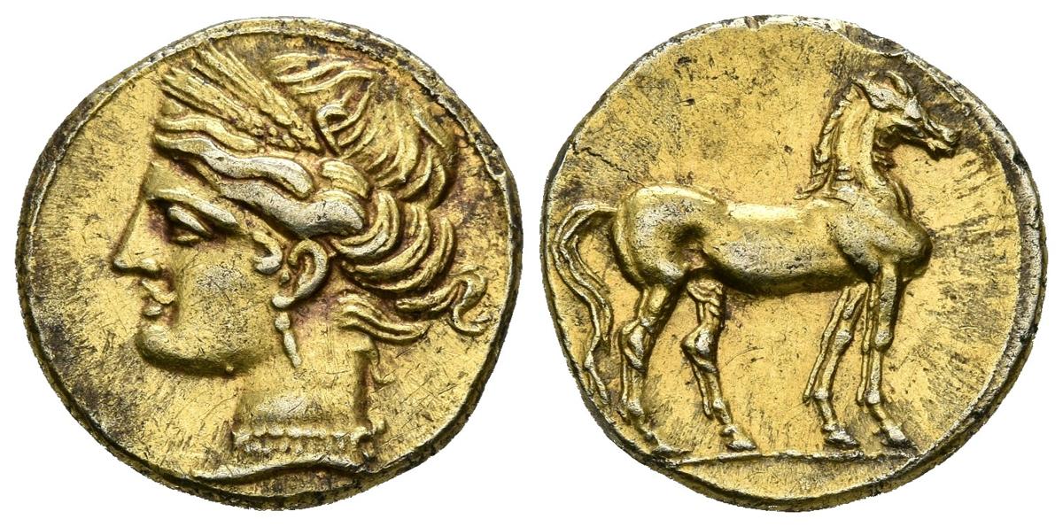 CARTAGONOVA (Cartagena, Murcia). 3/8 Stater. (El. 2.80g / 16mm). 235-220 BC (FAB-477). Anv: Head of Tanit to the left. Rev: Horse to the right. Almost Extremely Fine. Precious specimen, rare and more like that,