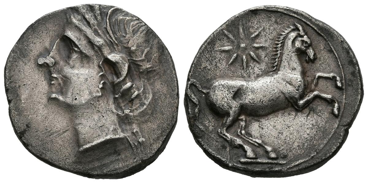 English CARTAGONOVA (Cartagena, Murcia). Shekel. (Ar. 7.30g / 22mm). 220-215 BC (FAB-493). Anv: Head of Tanit to the left. Rev: Horse jumping to the right, star above. Good Very Fine. Rare