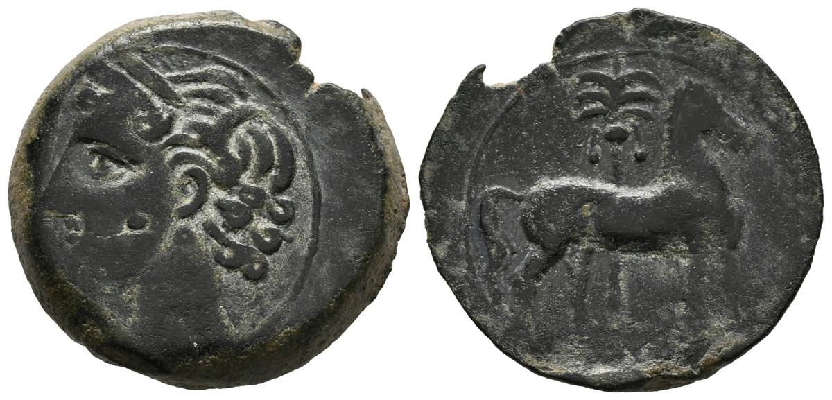 CARTAGONOVA (Cartagena, Murcia). Tracing. (Ae. 8.68g / 24mm). 220-215 BC (FAB-505). Anv: Head of Tanit to the left. Rev: Horse standing to the right, behind palm tree. Good Very Fine.