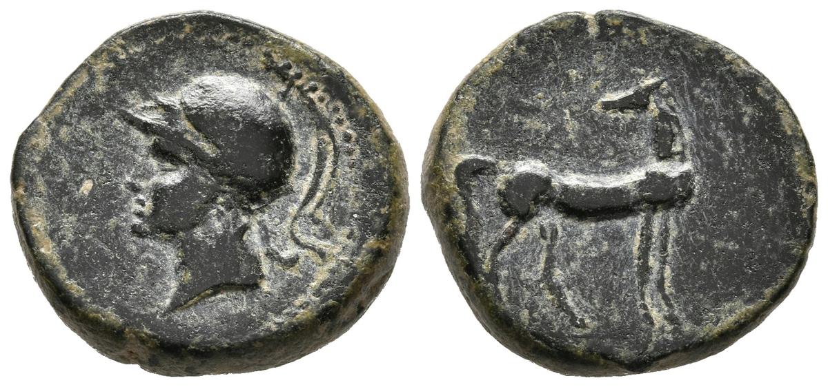 CARTAGONOVA (Cartagena, Murcia). 1/2 Tracing. (Ae. 4.95g / 19mm). 220-215 BC (FAB-517). Anv: Head of Arles with helmet on the left. Rev: Horse standing to the right, looking to the left. Good Very Fine.