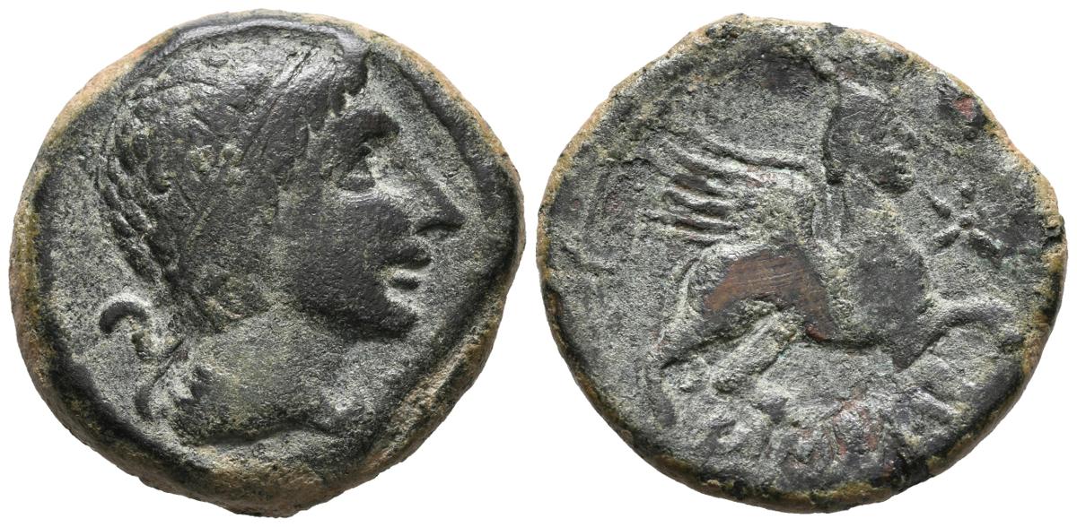 English CASTULO (Cazlona, Jaén). As. (Ae. 16.05g / 29mm). 180 BC (FAB-694). Anv: Male head diademic to the right. Rev: Sphinx on the right, in front of the star, below the curved retrograde legend: CaSTeLE. Very Fine.