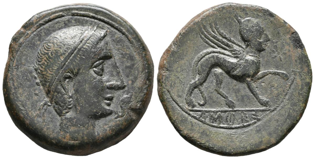 CASTULO (Cazlona, Jaén). As. (Ae. 13.68g / 28mm). 180 BC (FAB-699 var). Anv: Diademic male head to the right, in front of the dolphin. Rev: Sphinx on the right, in front of the star, below the Iberian legend line: CaSTeLE. Very Fine.