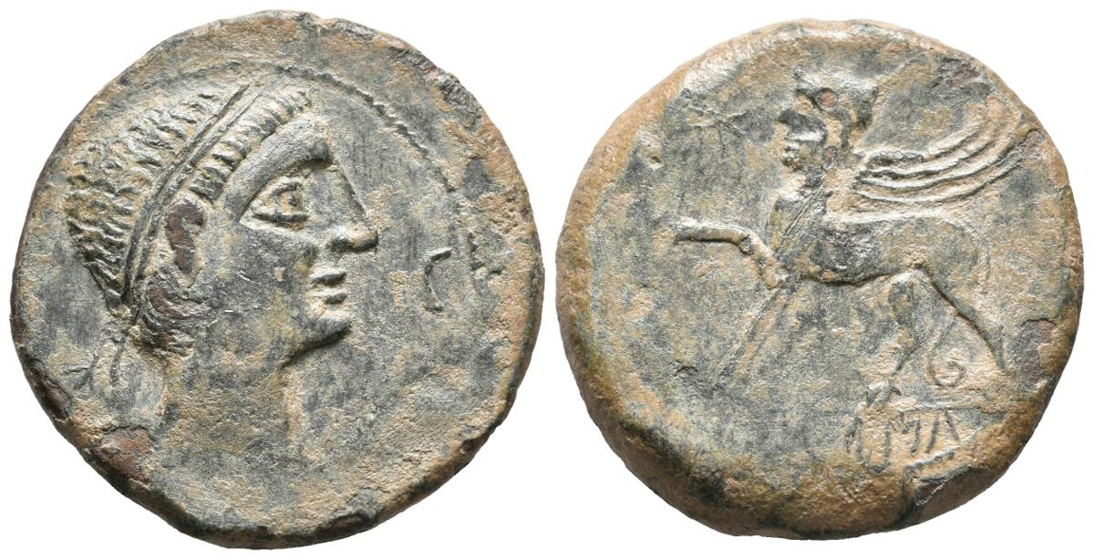 English CASTULO (Cazlona, Jaén). As. (Ae. 13.80g / 29mm). 180 BC (FAB-703). Anv: Male head diademic to the right, front crescent. Rev: Sphinx on the left, in front of the star, below the Iberian legend line: CaSTeLE. Good Very Fine.