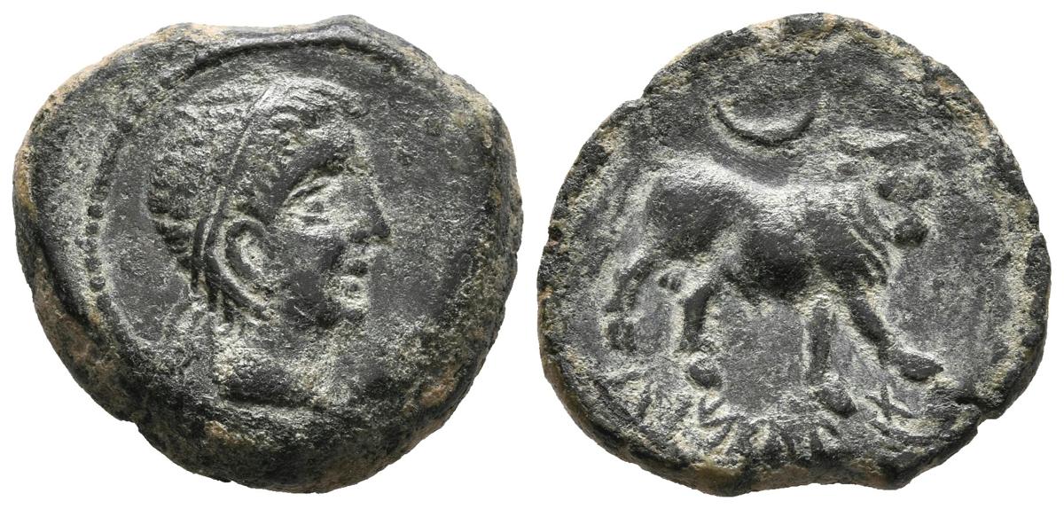 CASTULO (Cazlona, Jaén). Semis. (Ae. 5.44g / 19mm). 180 BC (FAB-712). Anv: Male head diademic to the right. Rev: Bull to the right, rising above, below curved Iberian legend: CaSTeLE. Good Very Fine.