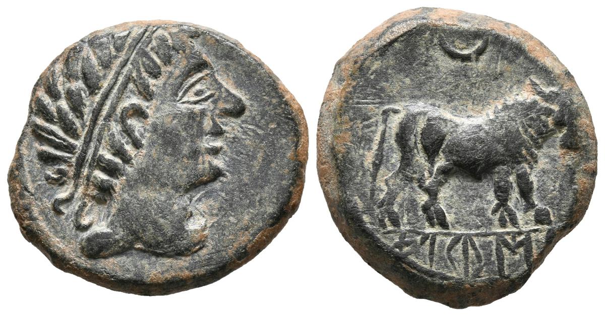 CASTULO (Cazlona, Jaén). Semis. (Ae. 6.16g / 20mm). 180 BC (FAB-716). Anv: Male head diademic to the right. Rev: Bull to the right, above crescent, below legend: CaSTeLE. Very Fine.