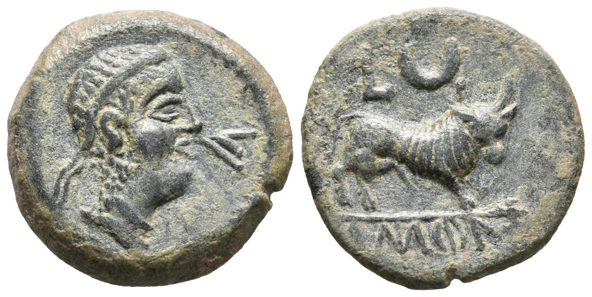 English CASTULO (Cazlona, Jaén). Quadrant. (Ae. 4.79g / 20mm). 180 BC (FAB-722). Anv: Male bust diademed to the right, in front of the Iberian letter Ca. Rev: Bull to the right, above L and crescent, below the Iberian legend: CaSTeLE. Good Very Fine.