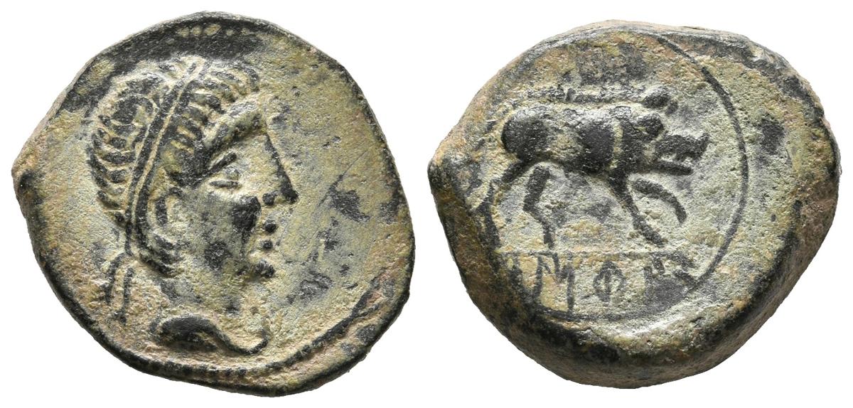 English CASTULO (Cazlona, Jaén). Quadrant. (Ae. 4.70g / 17mm). 180 BC (FAB-733). Anv: Male head diademic to the right. Rev: Wild boar on the right, below the Iberian legend line: CaSTeLE. Very Fine.
