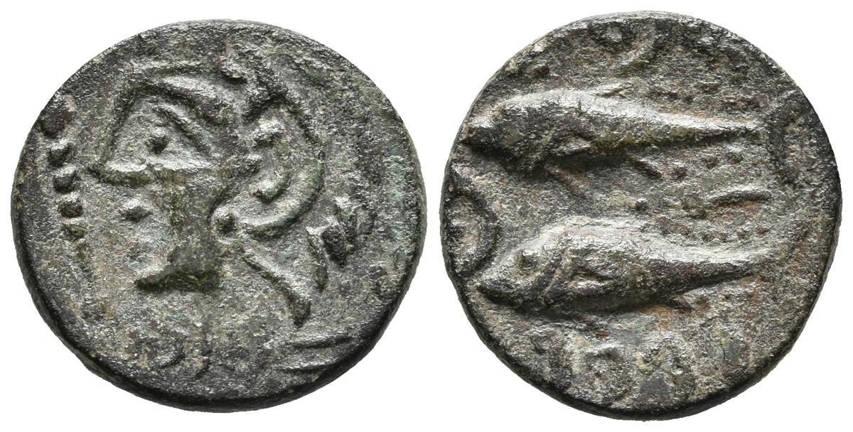 GADES (Cádiz). Semis. (Ae. 3.56g / 19mm). 100-20 BC (FAB-1347). Anv: Head of Melkart on the left with lion skin, in front of it nails. Rev: Two tunas on the left between Punic type B legend, among them, crescent with point and letter Alef. Very Fine.