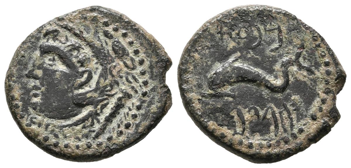 GADES (Cádiz). Quadrant. (Ae. 2.97g / 18mm). 100-20 BC (FAB-1352). Anv: Melkart head left behind nails. Rev: Dolphin on the left between Punic legend type B. Very Fine.
