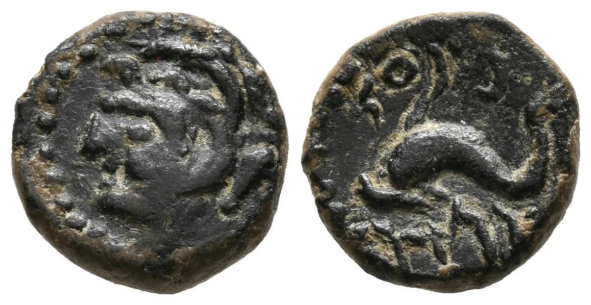 English GADES (Cádiz). Sextant. (Ae. 1.64g / 112mm). 100-20 BC (FAB-1357). Anv: Melkart head left behind nails. Rev: Dolphin on the left between Punic legend type B. Very Fine.